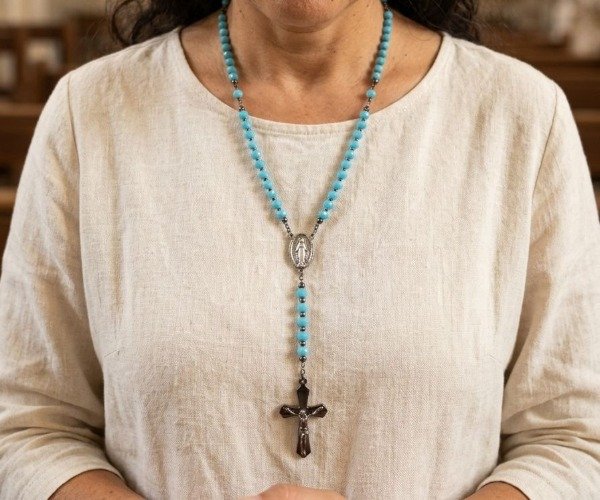 Rosario piedra celeste acero quirurgico,cruz con cristo.