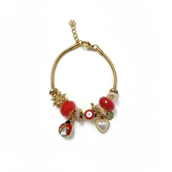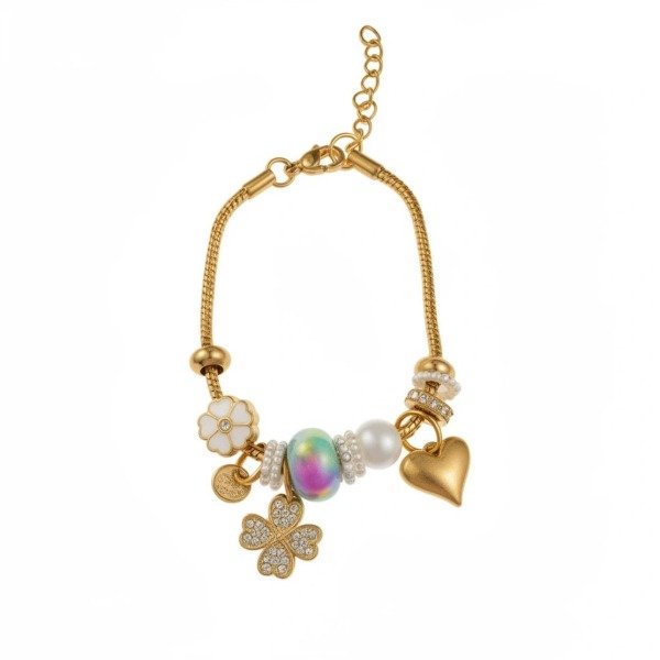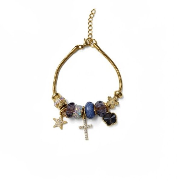 Pulsera de acero dorado con charms colgando 17,5cms de largo, con opción de alargue de 3cms más.